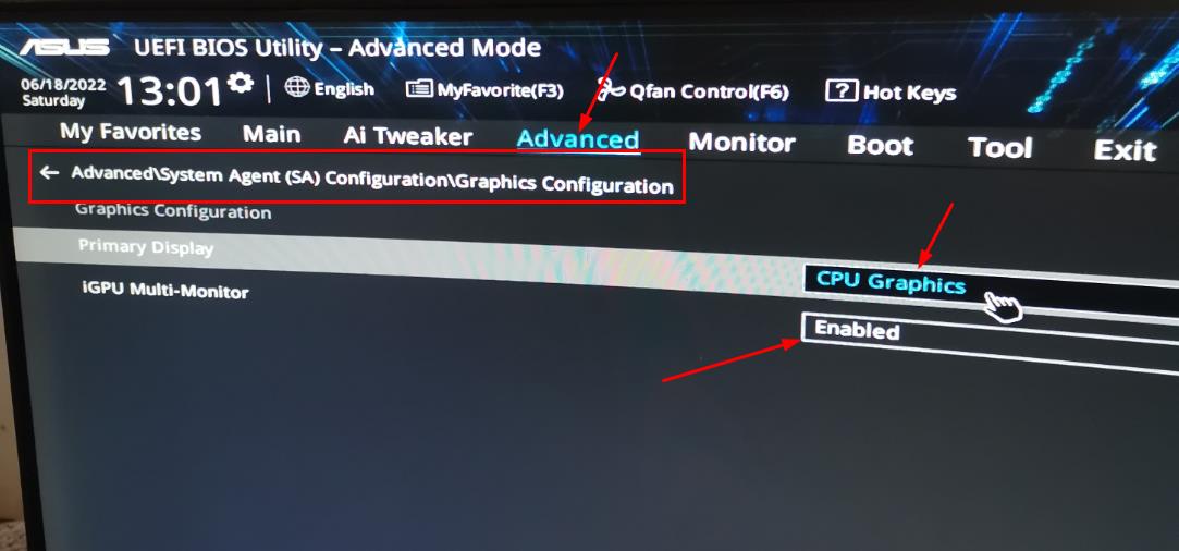 华硕主板设置核显的方法进BIOS---Advanced---System Agent (SA) Configuration---Graphics Configuration下,先找到iGPU Multi-Monitor的项目,默认是Disabled关闭,...
